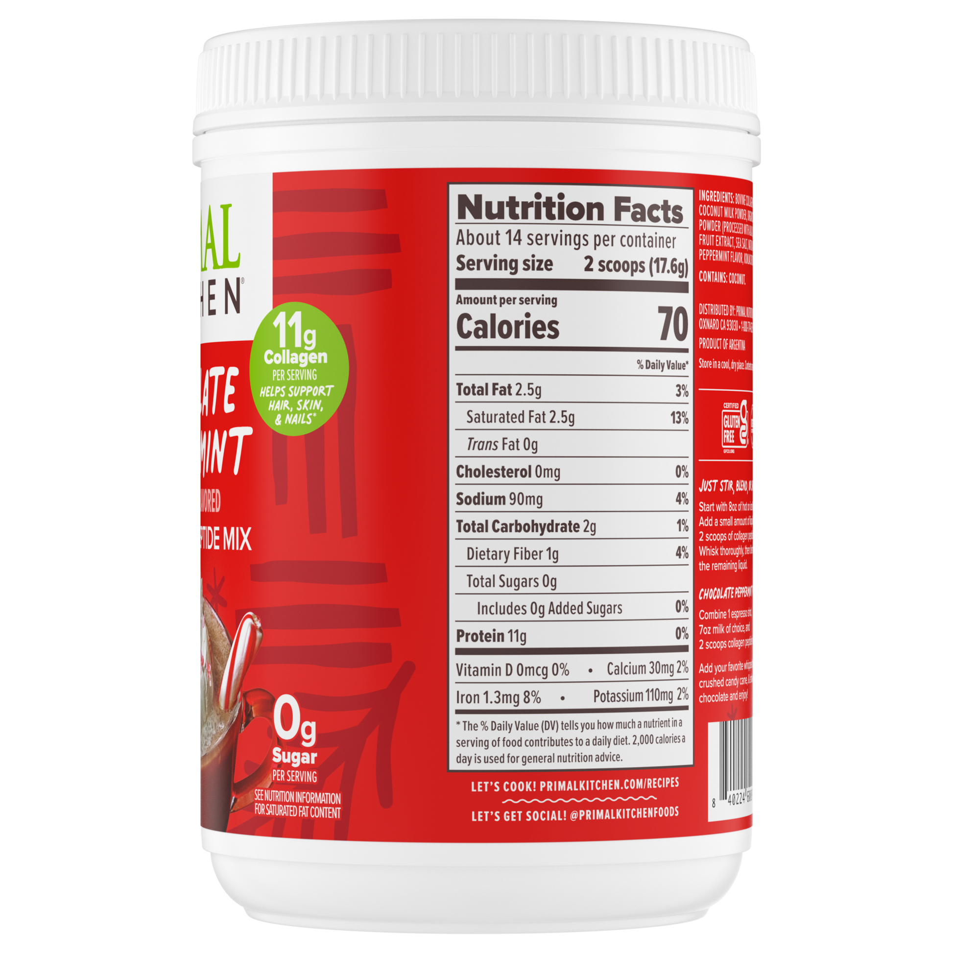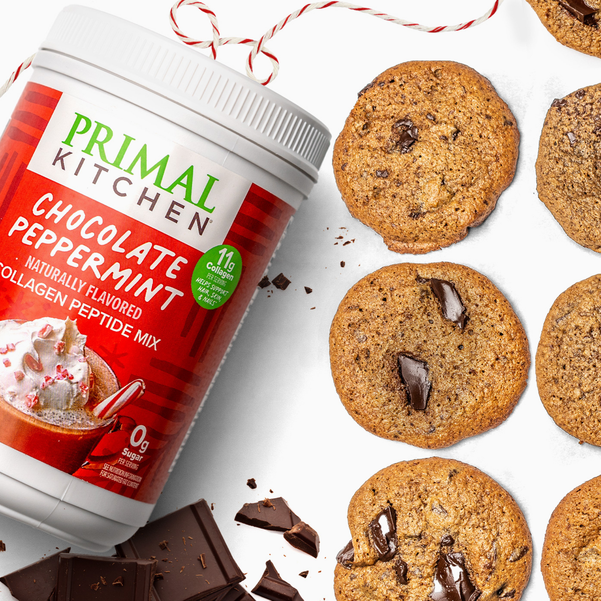 Get your winter glowing with the flavors of cozy cocoa and bright peppermint! With 11g of collagen per serving, Primal Kitchen Chocolate Peppermint Collagen Drink Mix gives the gift of skin, hair, and nail support in every cozy sip.