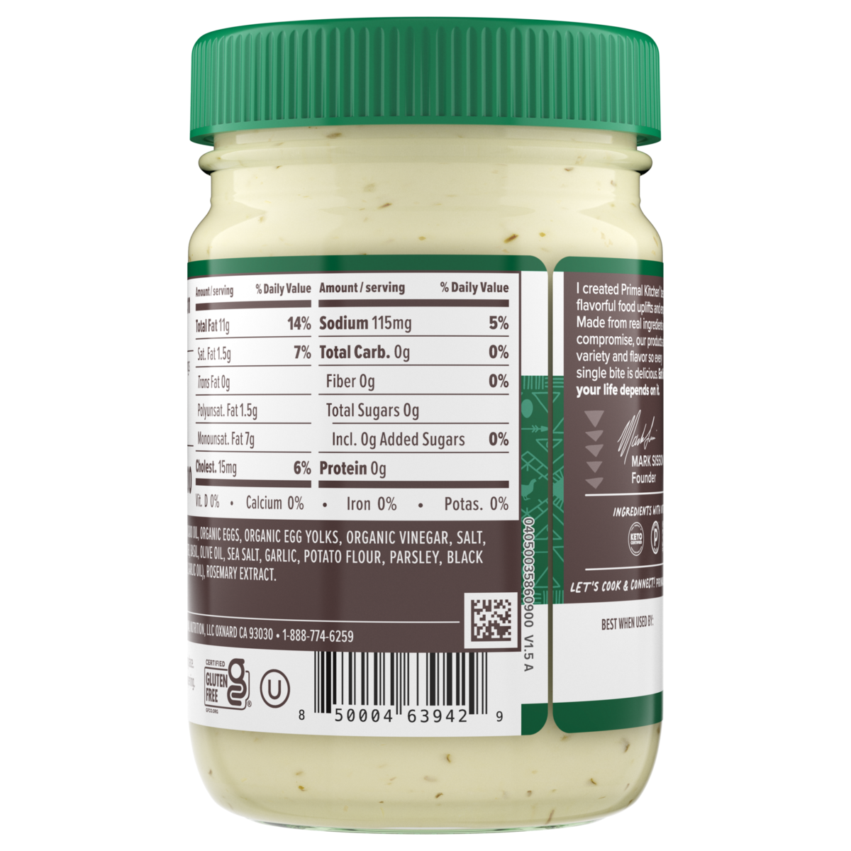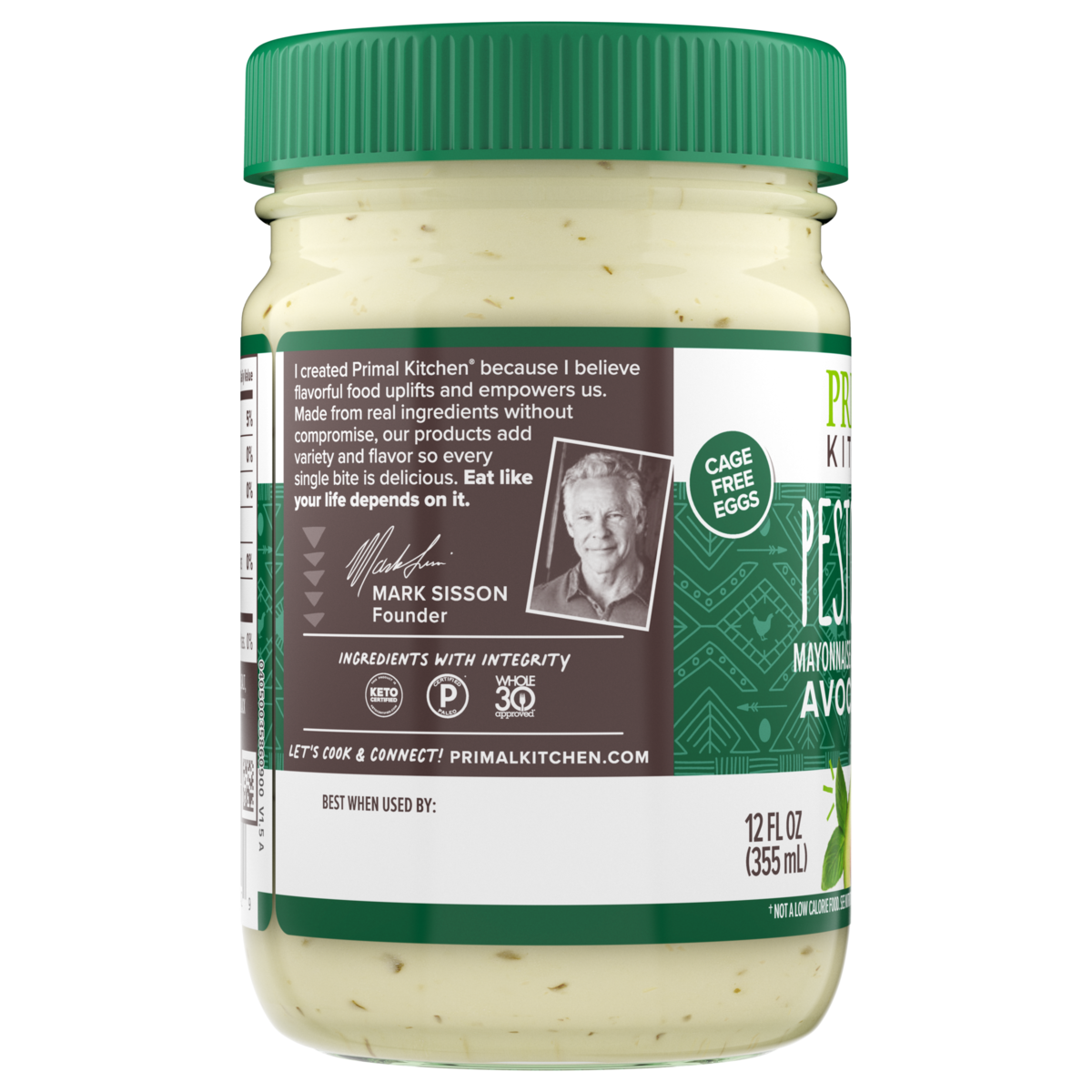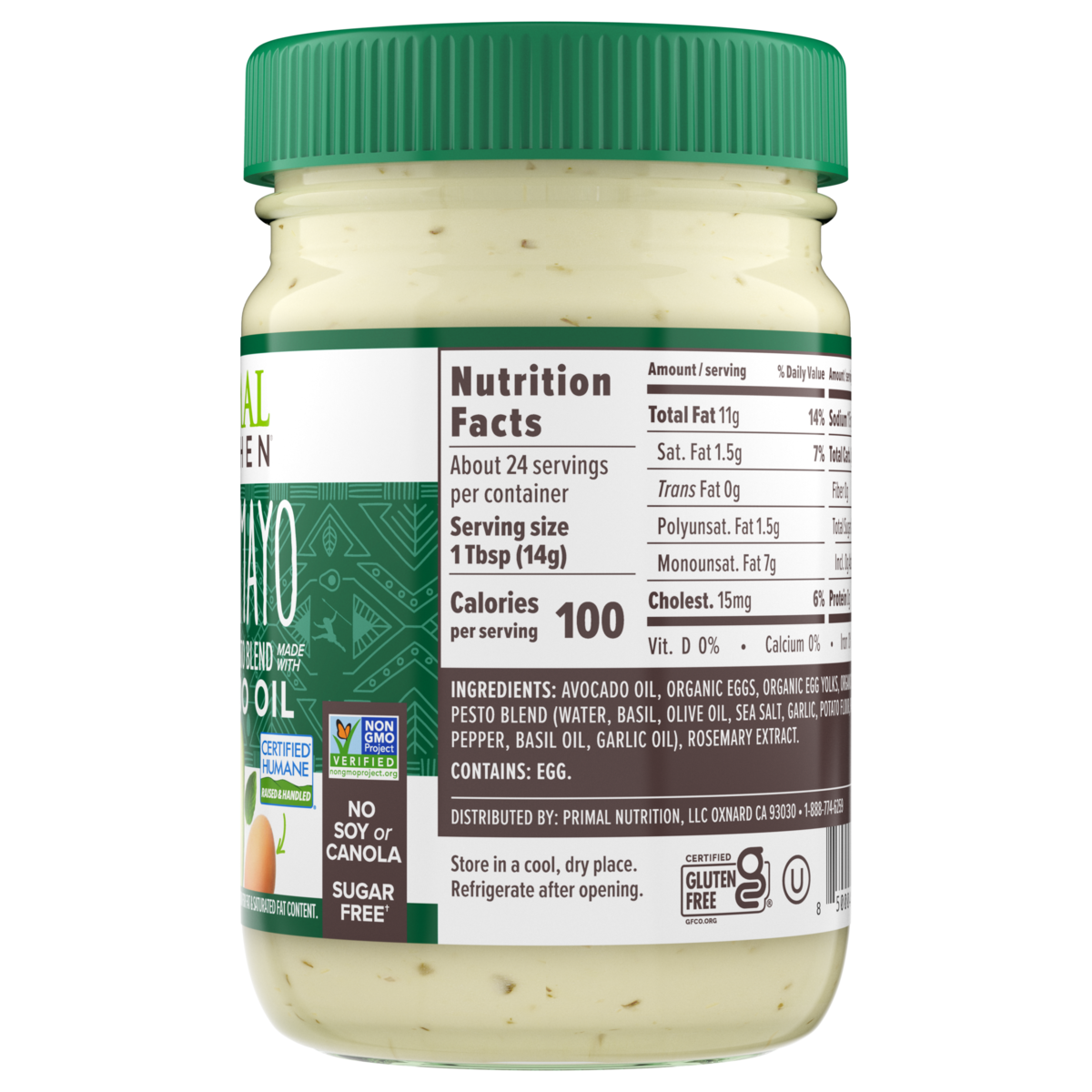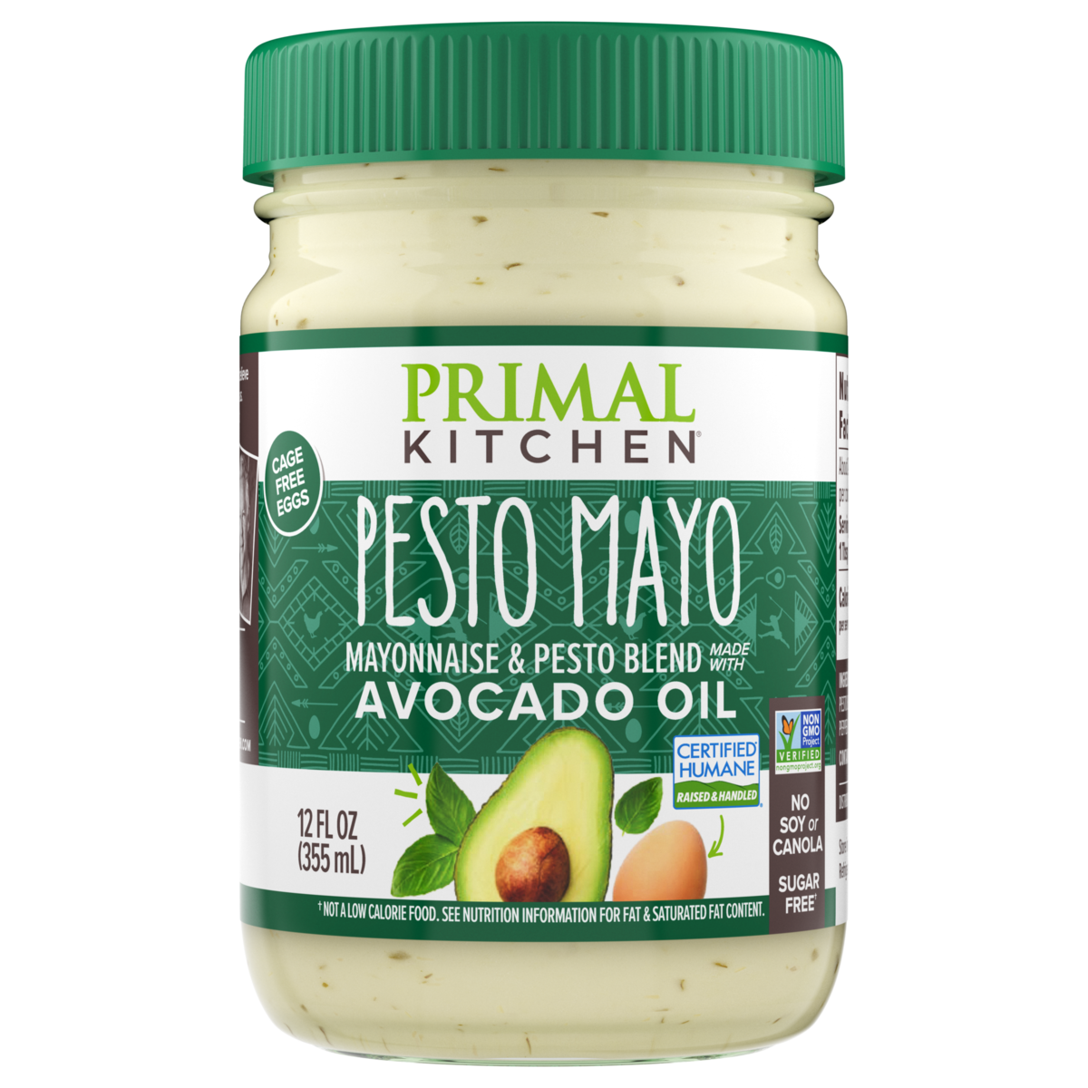 Simply the best-o! This avocado oil-based mayonnaise and pesto blend makes a delish dip for almond-crusted baked veggies, a garnish for savory soups, or as a sassy sauce for white pizza.